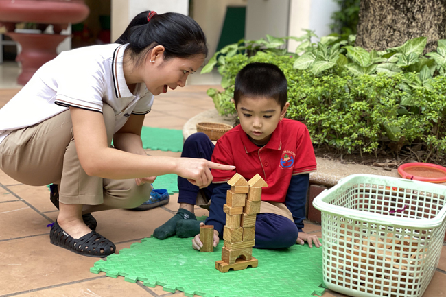 Hoạt động ngoài trời của cô giáo và học sinh Trường mầm non 20-10 (quận Hoàn Kiếm, Hà Nội).